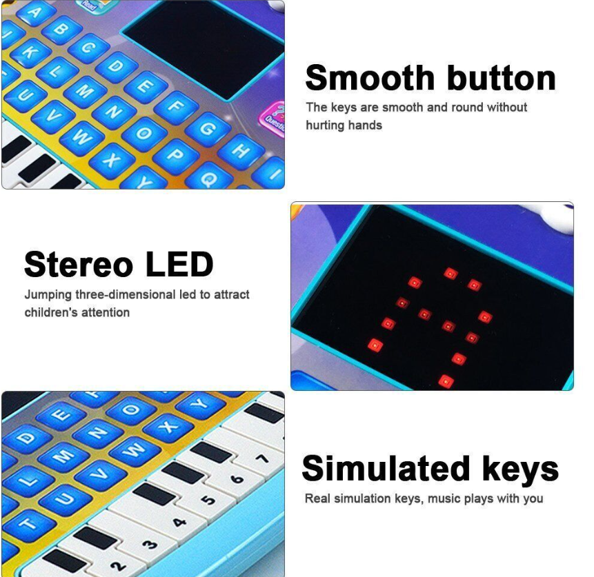 • Kids Tablet Toys With LED Light & Music. features the smooth emulational piano keys. Press the piano key to play piano tunes.