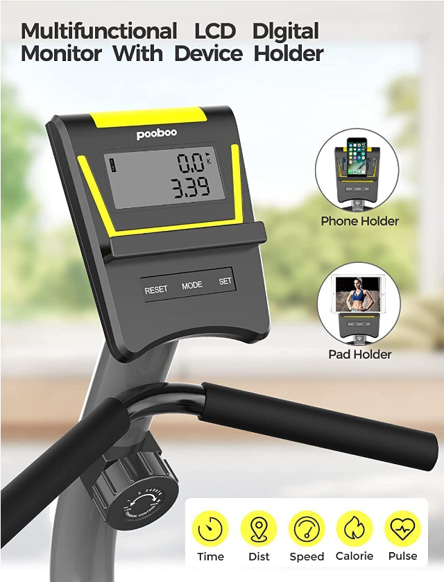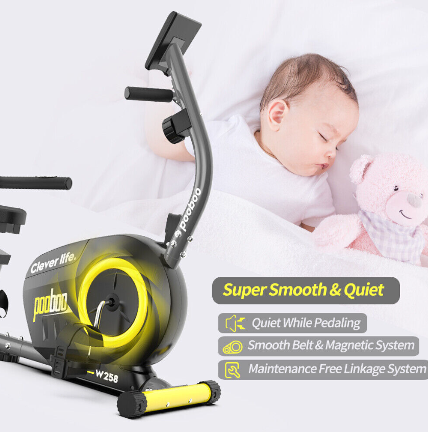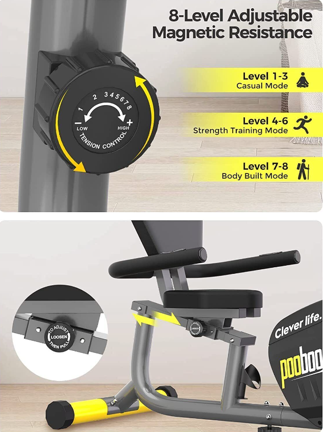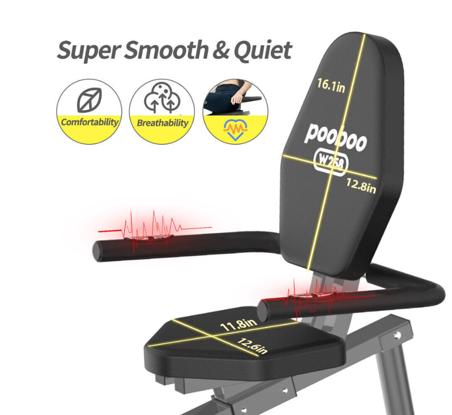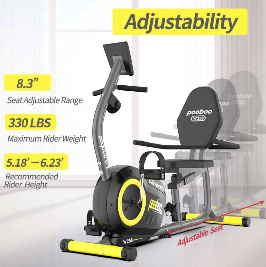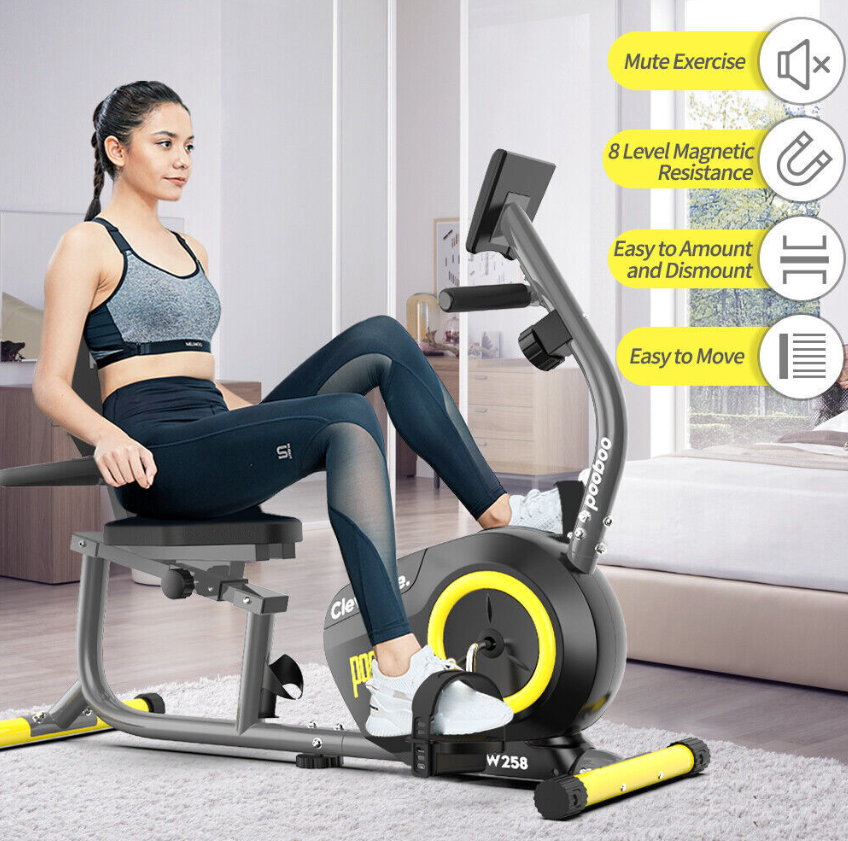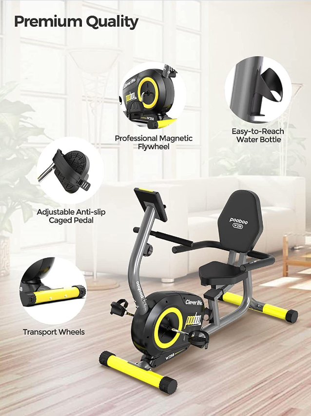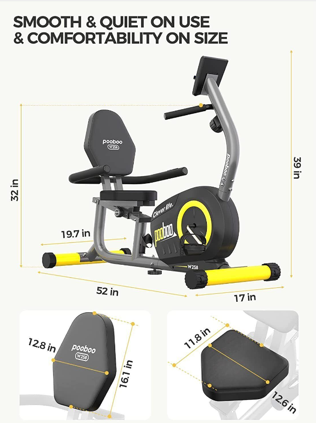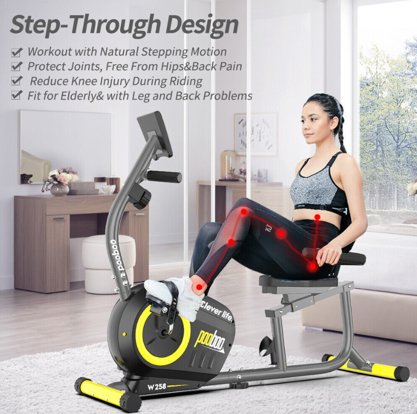 Pulse Sensor Monitor HandrailOur well-designed recumbent exercise bike equips with high -quality belt transmission systems and magnetic induction regulating resistance devices will reduce the use of noise to minimize, and will not disturb others.  | Comfortable Adjustable Big Size SeatThe seat and backrest is padded with high-density foam and wrapped with good-quality leather. The angle between the seat and the backrest is designed by ergonomics, which can give you more comfortability and ensure correct posture. By adjusting the seat, you can easily find the perfect position to fit your size.  | PortabilityConvenient transport wheels mounted to the rear stabilizer enable users to tilt and roll the equipment from one place to another; no need for heavy lifting or muscle strain. Effortless, you can make your home as a personal fitness studio  | Step-through DesignThe step-through ergonomic design not only creates facility for your getting on and off the bike, but also reduces the stress and friction to your hip and protect knees. You can get the best workout possible with this bike.  |