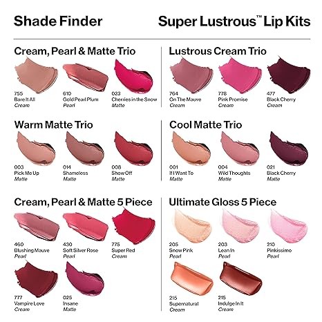 • 5 PIECE MULTI FINISH LIPSTICK KIT includes 460 Blushing Mauve (Plum/Berry pearl finish), 430 Soft Silver Rose (Pink pearl finish), 775 Super Red (Red/Coral cream finish), 777 Vampire Love (Plum/Berry cream finish)