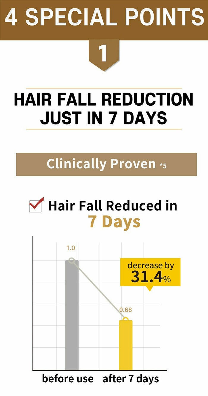 This two-month usage Ampoule is formulated with 84% high concentration of herbal ingredients such as whole Korean Ginseng, Lingzhi, Wilfordi Root and Ginger to reduce hair fall & strengthen weakened scalp & hair.