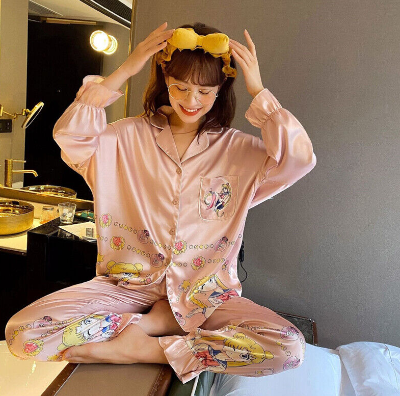 Sailor Moon Ice Silk Pajamas Set Women Cartoon V-neck Long Sleeve Sleepwear Pink